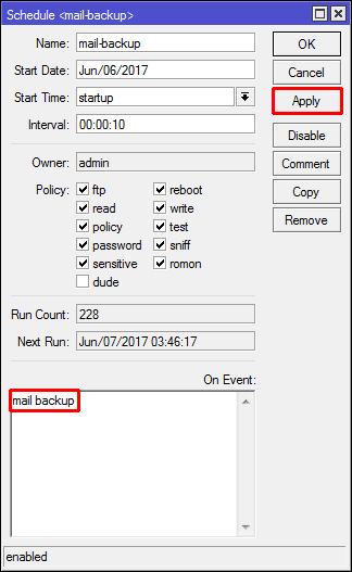 - Start Time, waktu kapan schedule yang dibuat akan berjalan, pada konfigurasi diatas saya menggunakan waktu Startup yang berarti schedule akan berjalan saat router menyala